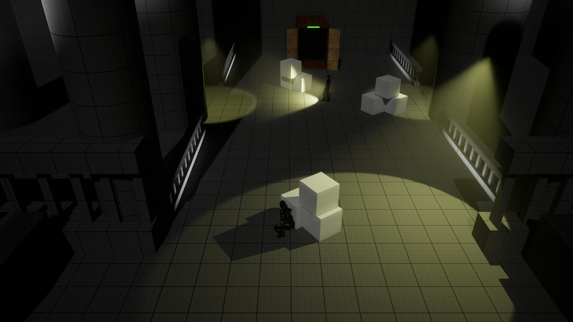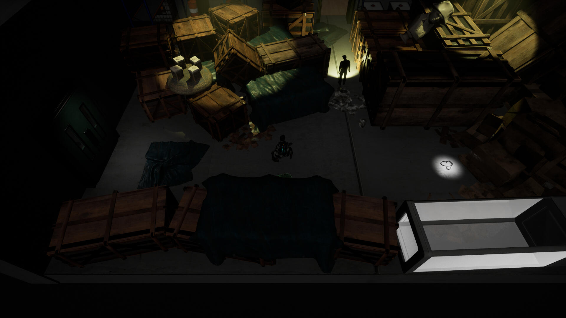 exhibit 1: the player hiding in the shadow cast by some containers.